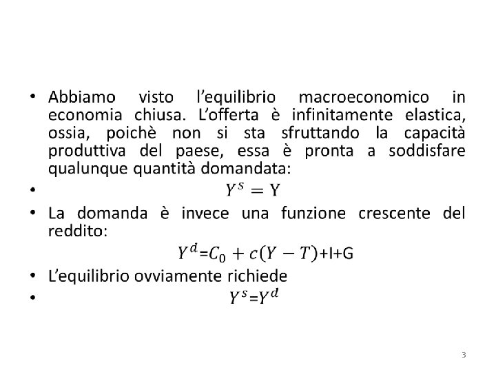 • In questo capitolo studiamo il meccanismo di aggiustamento della bilancia dei pagamenti tramite variazioni nel livello del reddito dei paesi in avanzo e in disavanzo • Si tratta dell’approccio keynesiano che si contrappone a quello classico che si basa sulle variazioni automatiche dei prezzi • Consideremo i prezzi fissi e lascieremo che sia il reddito a variare, mentre prima era vero il contrario • Cosidereremo il caso in cui la produzione nel paese considerato è inferiore a quella di pieno impiego • Infine, faremo una sintesi di quando gli squilibri della bilancia dei pagamenti influenzano simultaneamente il reddito, i tassi di cambio, i prezzi, i salari e i tassi d’interesse 2