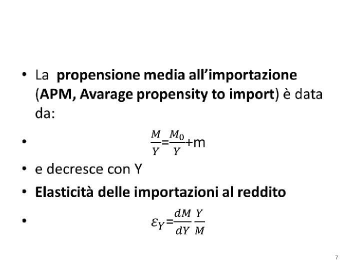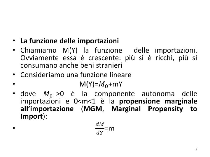 • La determinazione del reddito in una «piccola» economia aperta • Le transazioni del paese in considerazione non influenzano il reddito degli altri partner commerciali • L’economia opera a un livello di produzione inferiore a quello di pieno impiego 5