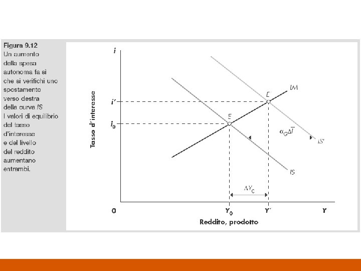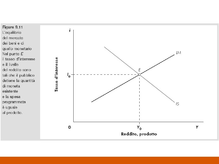 1. AD AD 2 E 2 3. AD 1 E 1 Y 2 4. Y i i 1 2. E 1 5. i 2 Y 1 Y 2 6. IS Y La prima operazione riguarda la determinazione della condizione di equilibrio della AD ad un determinato tasso di interesse i 1; In questo caso, a parità di ogni altra condizione, il reddito di equilibrio è Y 1; Spostandoci nel grafico della IS e proiettando il punto Y 1 sull’ asse X e riferendoci al tasso di interesse i 1, individuiamo un primo punto della IS: E 1; Ora supponiamo che il tasso di interesse scenda al livello i 2: poiché il denaro costa meno, la spesa per investimenti salirà e quindi la domanda aggregata si sposterà verso l’alto (AD 2); Spostandoci di nuovo sul grafico della IS e proiettando il punto di equilibrio corrispondente al nuovo livello di reddito (Y 2), otteniamo il secondo punto della IS; Ora tracciamo la IS come la retta passante dai due punti individuati.