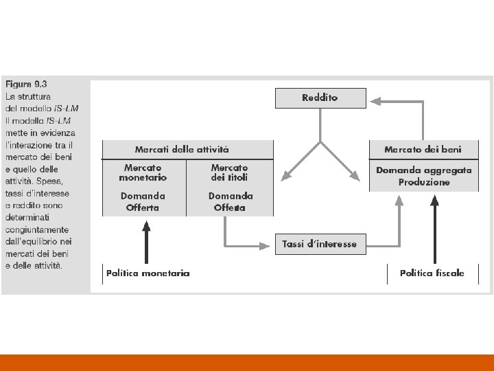 Il modello IS – LM • La curva AD descrive l’equilibrio nel mercato dei beni in relazione alla variabile PIL • La curva IS descrive il mercato dei beni in relazione a due variabili: – PIL; – Tasso di interesse (i) • La curva LM descrive l’equilibrio sul mercato monetario che si realizza quando domanda ed offerta di moneta coincidono – La domanda di moneta dipende dal reddito e dal tasso di interesse – L’offerta di moneta dipende da decisioni autonome della banca centrale • Il modello IS – LM individua i valori del PIL e del tasso di interesse che portano simultaneamente in equilibrio il mercato dei beni e il mercato monetario