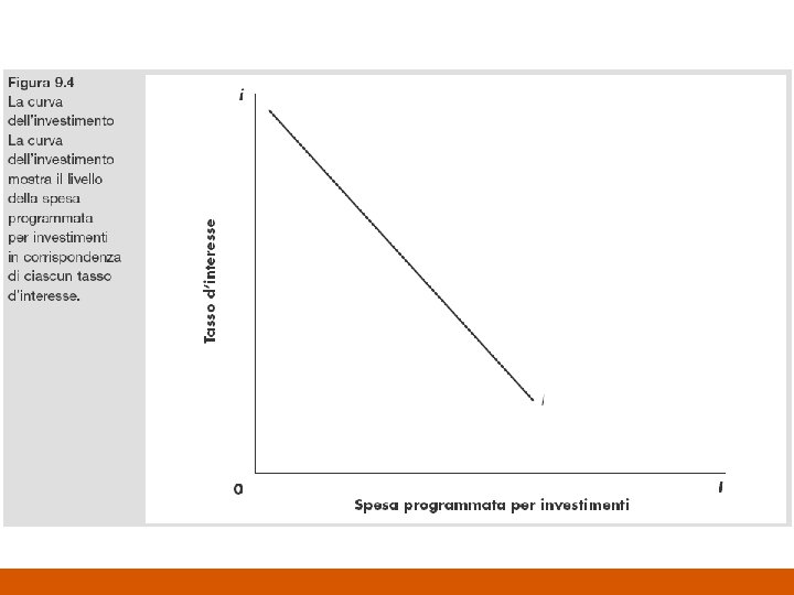 Investimento autonomo e investimento dipendente dal tasso di interesse • Dove I = Ī – (b*i) – Ī è la spesa autonoma per investimenti, cioè quella che non dipende né dal livello del reddito né dal tasso di interesse – i rappresenta il tasso di interesse – Il coefficiente b misura il grado di sensibilità degli investimenti alle variazioni del tasso di interesse • L’equazione esprime il fatto che quanto minore è il tasso di interesse, tanto maggiore è l’investimento programmato • Esempi – – a. I = 100 – (10*2) = 80 b. I = 100 – (20*2) = 60 c. I = 100 – (10*4) = 60 d. I = 100 – (20*4) = 20 • Gli esempi dimostrano che un aumento relativamente modesto del tasso di interesse (a parità di b) provoca una diminuzione considerevole della spesa in investimenti