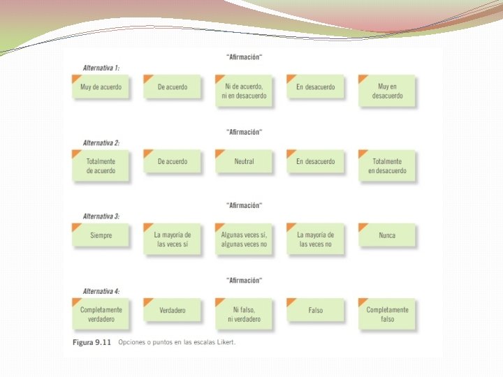 Escalamiento tipo Likert : Este método trata de un enfoque vigente y bastante popularizado. Consiste en un conjunto de ítems que se presentan en forma de afirmaciones para medir la relación del sujeto en tres, cinco o siete categorías. En este caso, la afirmación incluye ocho palabras y expresa una sola relación lógica(X-Y). Las opciones de respuesta o puntos de la escala son cinco e indican cuanto se está de acuerdo con la frase correspondiente.