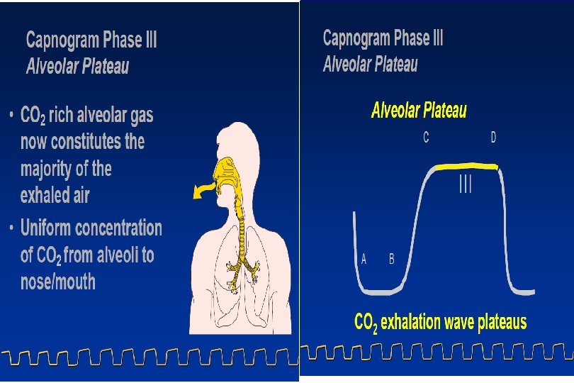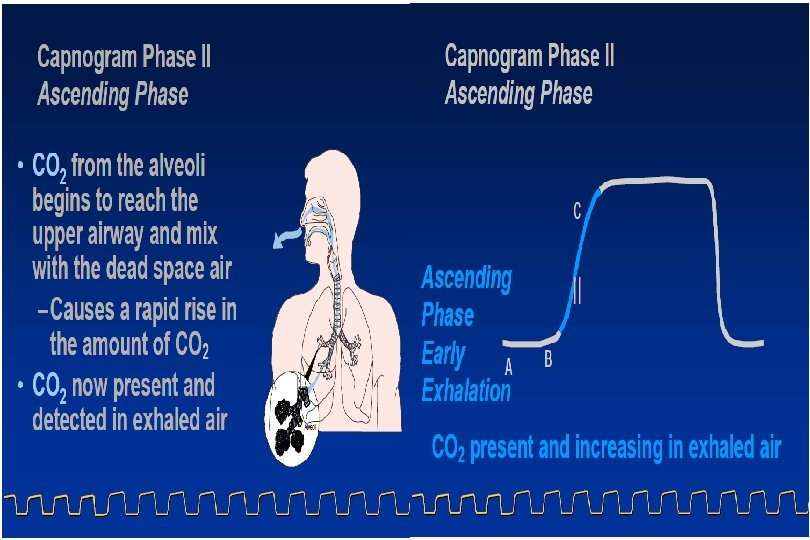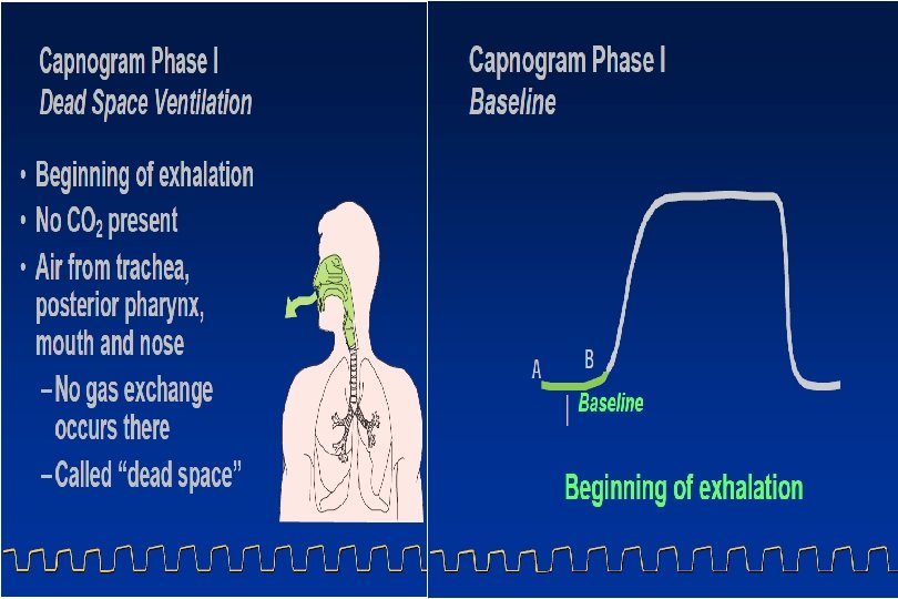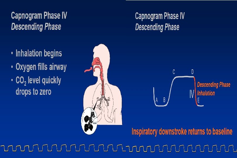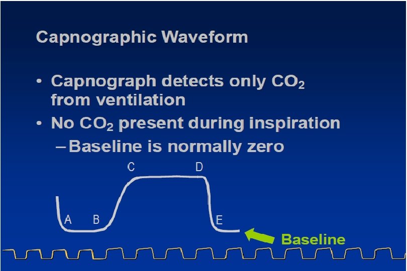Capnogram Examples and Interpretations • The “normal” capnogram is a waveform which represents the varying CO 2 level throughout the breath cycle. • Waveform Characteristics: • A-B Baseline B-C Expiratory Upstroke • C-D Expiratory Plateau D End-Tidal • D-E Inspiration