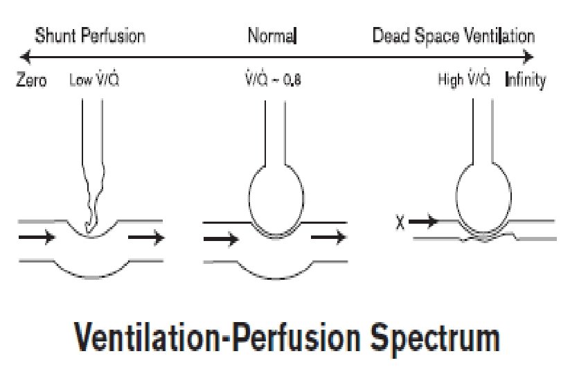 Ventilation-Perfusion Relationships • The ventilation-perfusion ratio (V/Q) describes the relationship between air flow in the alveoli and blood flow in the pulmonary capillaries. • If ventilation is perfectly matched to perfusion, then V/Q is 1. • Both ventilation and perfusion are unevenly distributed throughout the normal lung. However , the normal overall V/Q is 0. 8. • Shunt perfusion occurs under conditions in which alveoli are perfused but not ventilated, such as: Mucus plugging, ET tube in mainstream bronchus , Atelectasis. • Dead space ventilation occurs under conditions in which alveoli are ventilated but not perfused, such as: Pulmonary embolism , Hypovolemia , Cardiac arrest