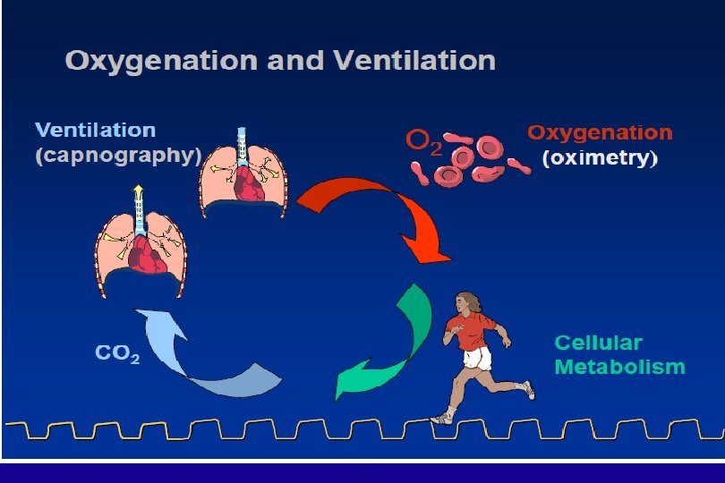 Capnography Depicts Respiration • Because all three components of respiration (metabolism, transport, and ventilation) are involved in the appearance of CO 2 in exhaled gas, capnography gives an excellent picture of the respiratory process. • Of course, oxygenation is a major part of respiration and therefore must also be monitored in order to complete the picture. This can be accomplished through pulse oximetry.