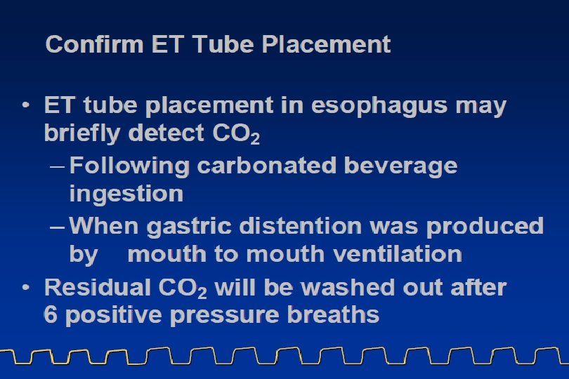 Endotracheal Tube in the Esophagus • A normal capnogram is the best available evidence that the ET tube is correctly positioned and that proper ventilation is occurring. • When the ET tube is placed in the esophagus, either no CO 2 is sensed or only small transient waveforms are present.