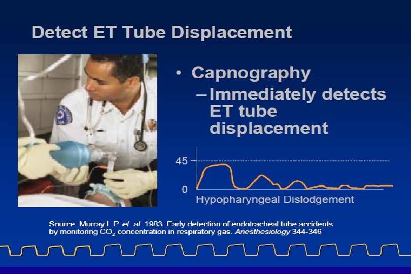 • This capnogram shows a complete loss of waveform indicating no CO 2 present. Capnography allows for instantaneous recognition of this potentially fatal condition. Since this occurred suddenly, consider the following causes: • Dislodged ET Tube • Total obstruction of ET Tube • Respiratory arrest in the non-intubated patient • Equipment malfunction (If the patient is still breathing) Check all connections and sampling chambers.