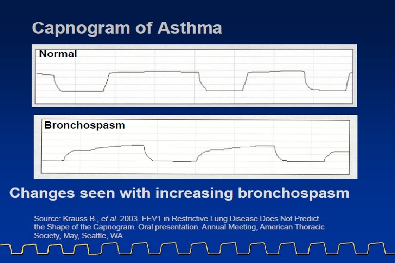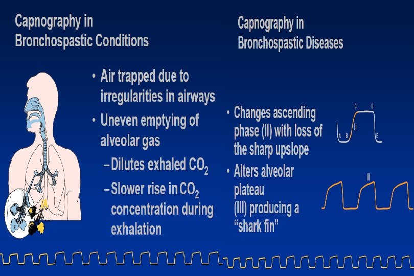 • This capnogram displays an abnormal loss of alveolar plateau meaning obstructed exhalation. Note the “Shark’s fin” pattern. This pattern is found in the following Bronchoconstriction • Asthma • COPD • Incomplete airway obstruction • Tube kinked or obstructed by mucous.