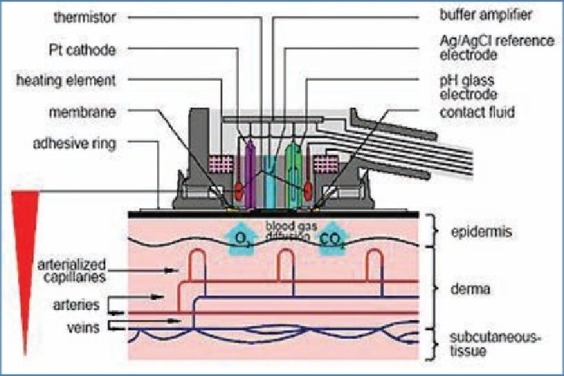 Transcutaneous Carbon Dioxide Monitoring • Transcutaneous carbon dioxide (CO 2) analysis was introduced in the early 1980 s using locally heated electrochemical sensors that were applied to the skin surface. Tc. CO 2 makes use of the fact that CO 2 gas diffuses through the body tissue and skin and can be detected by a sensor at the skin surface. • CO 2 is measured potentiometrically by determining the p. H of an electrolyte layer separated from the skin by a highly permeable membrane. As CO 2 diffuses through the membrane there is a change in the p. H of the electrolyte, CO 2 then reacts with water to form hydrogen and bicarbonate ions. • A change in p. H is proportional to the logarithm of PCO 2 change. The p. H is determined by measuring the potential between a miniaturized p. H glass electrode and a silver chloride reference electrode.