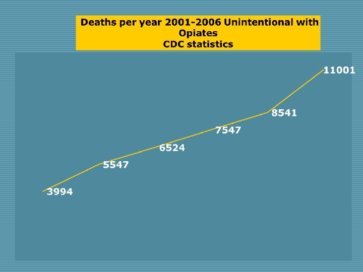 Opioid Prescriptions Soar o In 2004, the United States used 99% of the world’s supply of hydrocodone o Between 1999 and 2002, in the United States, there has been a 91. 2% increase in deaths due to opioid overdose.