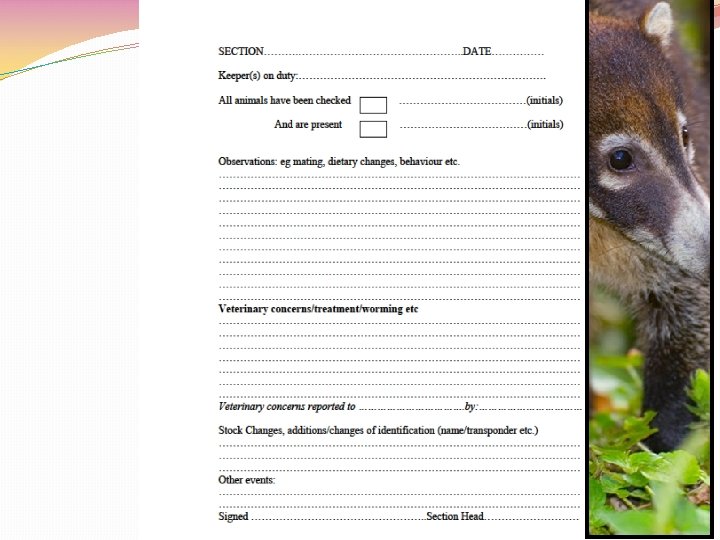 Record Keeping �Legal requirement of EU Zoos Directive (1999) �Keeping records on individual animals allows �monitoring health �managing effective breeding programmes