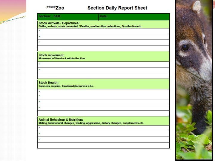 Daily Reports �These are filled in by keepers, in paper or electronic form �The record keeper uses the information to update animal collection records �Daily records need to include all the information required to complete records in ARKS or ZIMS �They should also ensure management is aware of any incidents or changes in the animal collection �BIAZA offers several alternative forms