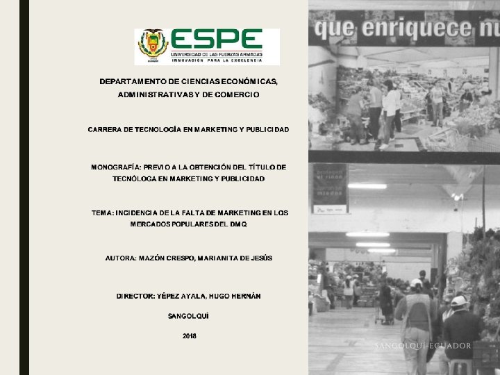 CAPÍTULO 2 FASE CUALITATIVA Objetivos específicos Objetivo general • Determinar por qué los mercados populares del DMQ no aplican marketing en sus actividades diarias. • Conocer el nivel de educación que posee el personal de los mercados populares del DMQ. • Determinar si el municipio u otros organismos públicos o privados brindan capacitación al personal. • Determinar si las autoridades municipales realizan control de asepsia a los productos que se comercializan en los mercados populares del DMQ. Hipótesis • H 1: EL marketing incide en los mercados populares del DMQ. • H 2: Los mercados populares del DMQ no tienen definidas estrategias de marketing. • H 3: Experiencia de compra. Ética del investigador • Confidencialidad de los datos obtenidos, los cuales permitirán comprobar las hipótesis y alcanzar los objetivos establecidos.