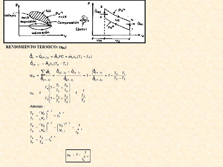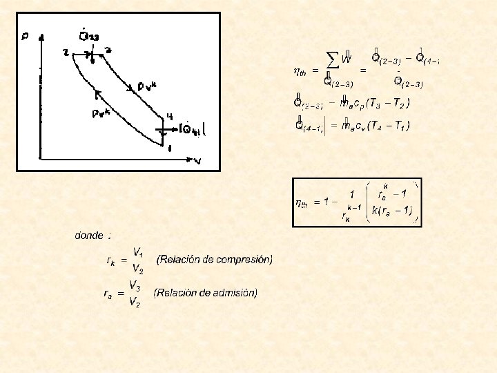 Motor a cuatro tiempos: 1 er Tiempo: ADMISIÓN Sólo entra aire (no existe carburador) 2 do Tiempo: COMPRESIÓN Eleva la temperatura a una mayor que la de la combustión del combustible. No existe bujía. 3 er Tiempo: INYECCIÓN DE COMBUSTIBLE Combustión. 4 to Tiempo: EXPULSIÓN O ESCAPE. Eliminan gases del cilindro. CETANO: capacidad antidetonante. El funcionamiento es similar al ciclo Otto, solamente cambia en la fase de la inyecciòn del combustible. Ahora serà un proceso isobàrico en lugar de un proceso isocòrico. dq = du + p dv = dh - v dp Como la presiòn es constante usaremos la segunda igualdad y dq = dh = m (h - h )