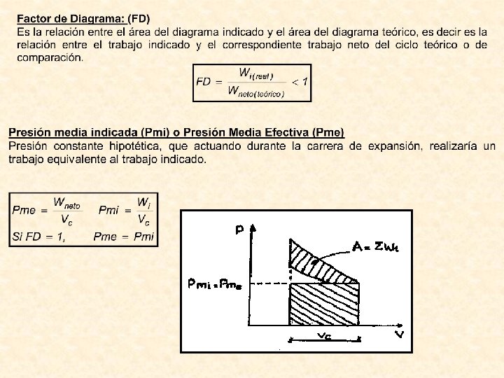 DIAGRAMA P -v CICLO OTTO REAL El diagrama P-v real del ciclo se saca del Osciloscopio donde podemos apreciar el ciclo verdadero dentro del motor. Para estudiar más fácilmente nosotros lo acondicionamos a un ciclo teórico ideal, pero manteniendo el mismo trabajo técnico (área dentro del ciclo P-v real). Para evitar cualquier error al hacer este cambio, es que consideramos un Factor de Diagrama f. D que corrige cualquier defecto. Wi = f. D x W teórico