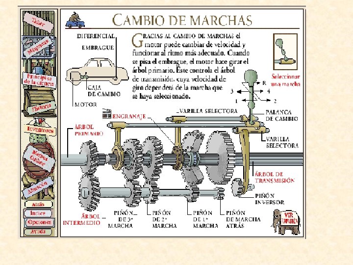 Caja de Cambios Sirve para cambiar la velocidad del carro, en realidad intercambia el torque con la velocidad para tener una misma potencia.