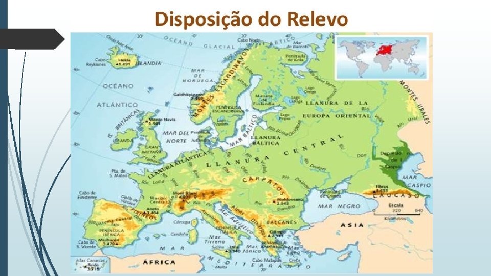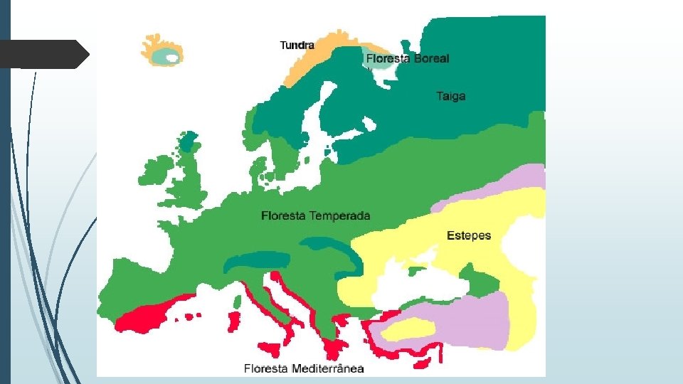 Características naturais da Europa Cadeias de montanhas: • Cáucaso: localizado na Geórgia, Federação Russa, Azerbaijão e Armênia; • Alpes: Alemanha, Suíça, Itália, Áustria, França; • Balcãs: Sérvia, Macedônia e Bulgária; • Pirineus: França e Espanha; • Montes Urais: limite natural entre a Europa e a Ásia; • Cárpatos: República Tcheca, Eslováquia, Romênia, Ucrânia e Polônia. Vegetação: • Estepes; • Pradarias; • Taiga; • Tundra; • Floresta temperada; • Vegetação mediterrânea.