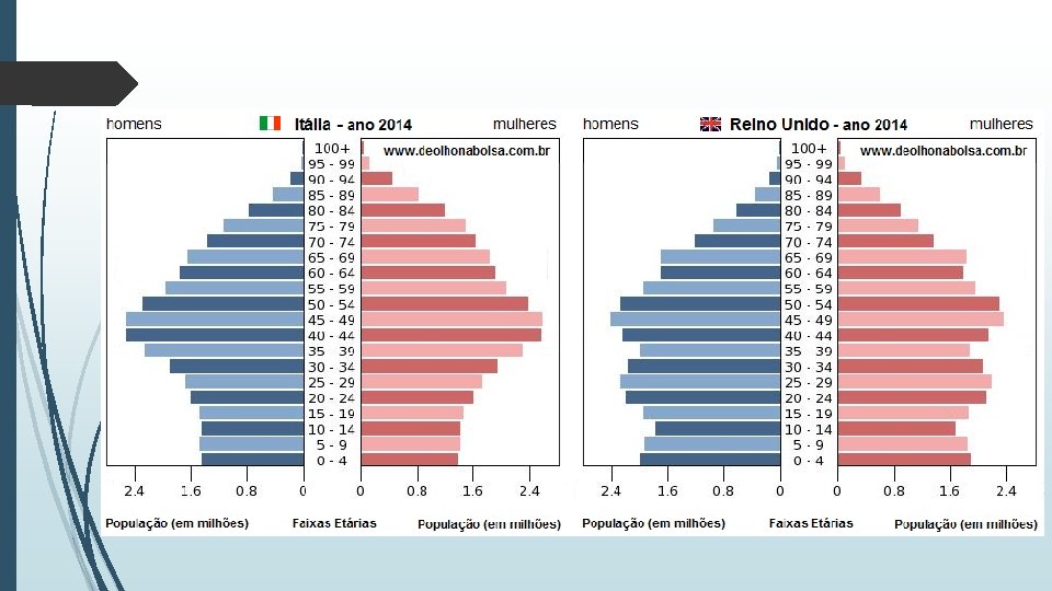 População europeia Elementos que favorecem a diminuição da sua população: • As pessoas optam por casar mais tarde; • A população tem mais desejo de melhorar sua condição social antes de ter filhos; • Elevado custo de vida; • Aumento do uso de anticoncepcionais; • Redução do número médio de filhos por mulher; • Maior acesso à educação; • Melhoria nas condições de saúde, incluindo a alimentação; • Maior participação da mulher no mercado de trabalho.