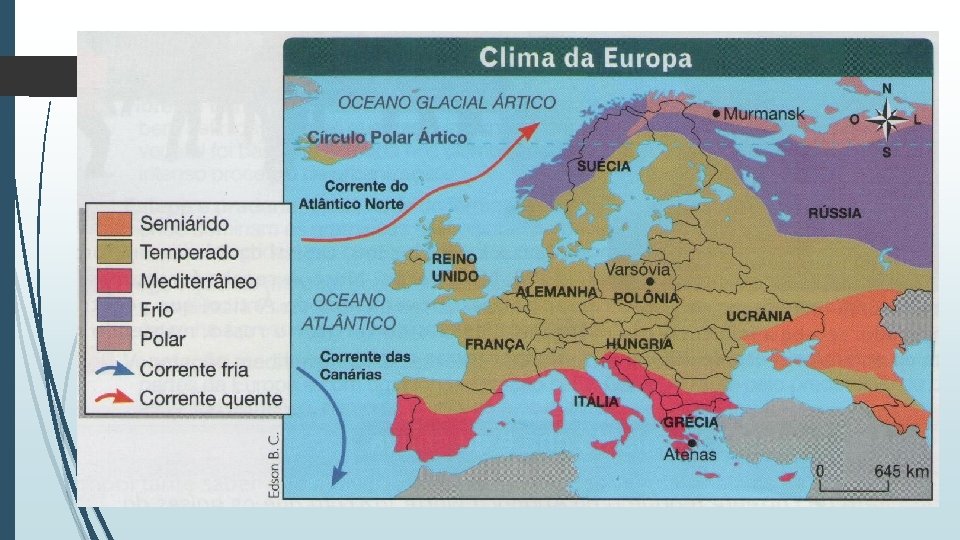 Características naturais da Europa Na maior parte do território, predomina o clima temperado: • Estações bem definidas; • Chuvas sem excessos; • Temperaturas amenas; • Ocorrência de neve no inverno. Outros tipos climáticos do continente: Subpolar, Frio de Altitude, Frio continental. Semi-árido. O relevo é formado basicamente por planaltos e maciços antigos, planícies, cadeias de montanhas e depressões. • Depressões: Holanda e fronteira com a Ásia. • Planícies: Centro-oriente. • Planaltos e maciços antigos: Planalto Central Russo, Montes Apeninos (Itália), Montes Urais(Rússia), Meseta Espanhola e o Maciço Central Francês.