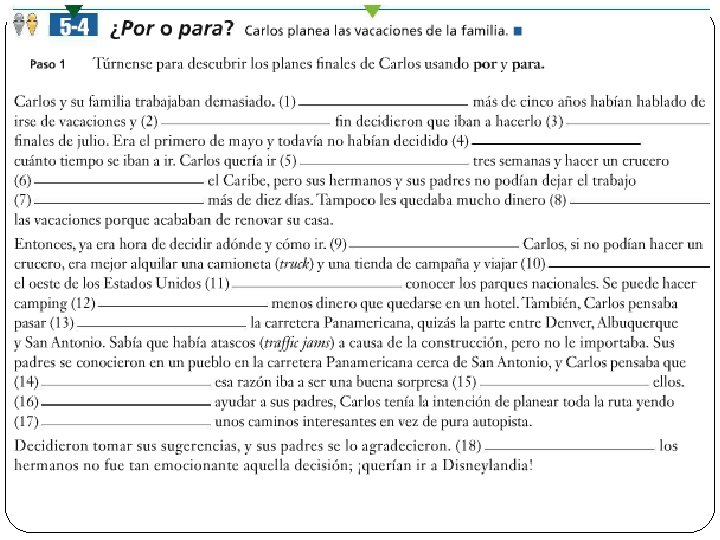 Regla (para indicar…) por para ejemplo Destino Paso a través de algo Intercambio Comparación Duración (tiempo) Fecha u hora límite Favor de alguien x X X X Esta noche saldremos para Argentina. Vamos a pasear por la Unive X X Te doy 50 dólares por tu libr La niña es muy alta para su Estudiamos por toda la noch La composición es para el v Con un compañero: Haré la tarea de español po Escribe un ejemplo para cada situación! Hablamos por teléfono por 2
