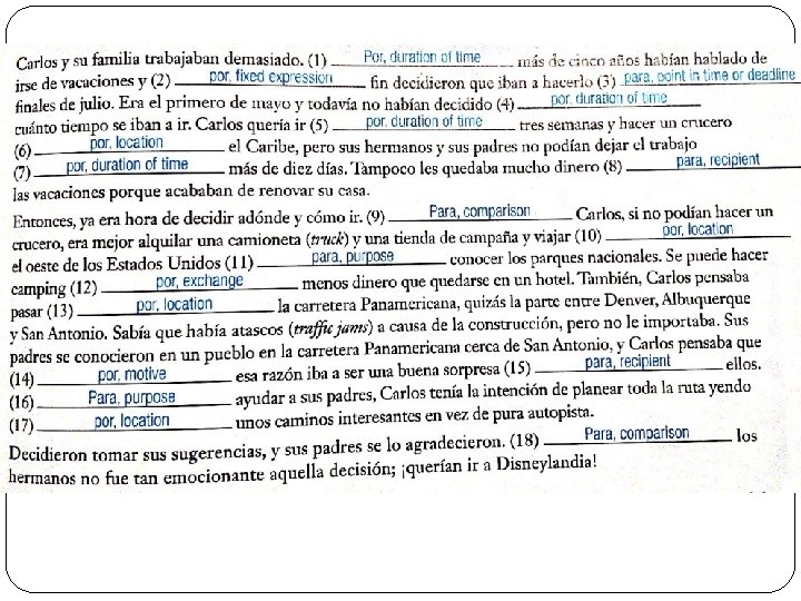 PARA: Por • Momento en el tiempo fecha límite (for, by) • Destino (for, to) POR: • Persona(s) que recibe • Duración de tiempo algo (for): (during, for) • Comparación (for): • Movimiento o lugar • Propósito u objetivo (through, along, past, around) (to, in order to): • Motivo (on account of, because of, for) • Intercambio (in exchange for) • Medios (by) y Para
