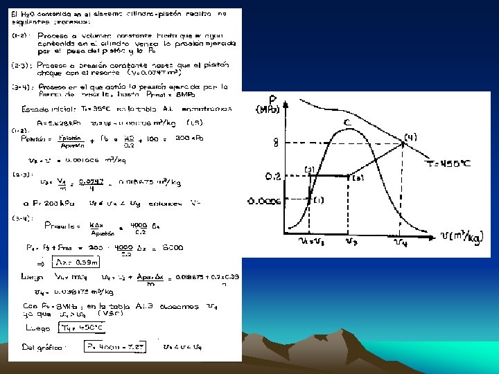 26. Considere el sistema cilindro-pistón sin fricción mostrado en la figura. El área de la sección transversal del pistón es 0. 2 m 2. Inicialmente el pistón descansa sobre el tope inferior del cilindro. Se sabe que la presión atmosférica es de 100 k. Pa y que el peso del pistón es de 20 k. N. Se transfiere energía al agua contenida en el cilindro, hasta que la presión sea de 8 MPa. Cuando el pistón toca el resorte el agua ocupa un volumen de 0. 0747 m 3. Si el cilindro contiene inicialmente 4 kg de líquido saturado a 35°C, se pide: a) La temperatura final del agua. b) La altura que se eleva el pistón. c) La ecuación del proceso durante el cual actúa el resorte, P = f(v). d) Graficar el proceso o procesos en el diagrama P-v. Constante del resorte: 4 MN/m