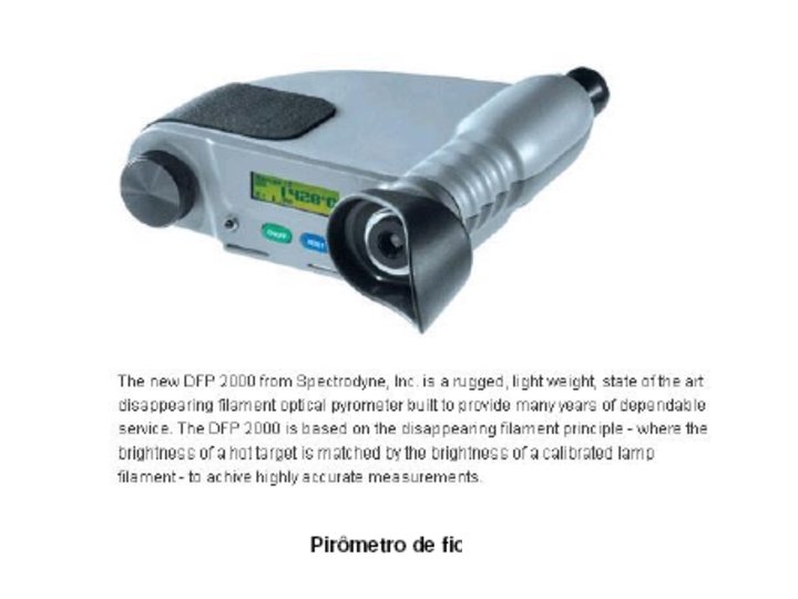 O pirômetro óptico ou termômetro de brilho de radiação monocromática, como é também chamado, baseiase no princípio de que, para um dado comprimento de onda , a intensidade da radiação (“brilho”) varia com a temperatura conforme vimos. Assim, a imagem do objeto alvo é superposta sobre aquela do filamento de tungstênio aquecido.