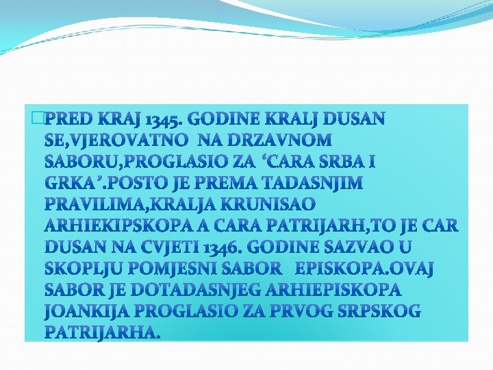 Dusanov Zakonik �Na Spasovdan 21. maja 1349. godine car Dusan je na drzavnom saboru u Skoplju donio svoj Zakonik u prisustvu patrijarha, svestenstva, knezeva i vlastele srpske i grcke. Sa dopunama, donesenim u Serezu 1354. godine, Zakonik se sastojao od 201 clana. Ovim zakonom car Dusan je srpskom carstvu udario cvrstu pravnu osnovu, sto je doprinjelo da odnosi u drzavi i u crkvi budu tako regulisani da pomazu daljem jacanju i crkve i drzave.