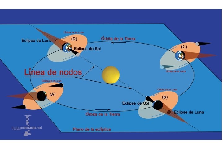 MOVIMIENTOS DE LA LUNA Rotación: tarde 28 días en dar un giro sobre sí misma Traslación: tarda también 28 días en recorrer su órbita alrededor de la Tierra (mes lunar) Órbita inclinada 5º respecto a la eclíptica Ambos movimientos son en sentido contrario a las agujas del reloj La coincidencia de los periodos de rotación y traslación hace que siempre veamos la misma cara de la Luna. Hay una cara oculta de la Luna.