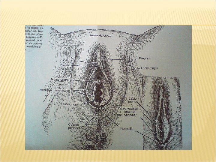 Monte de venus Comisura anterior del pudendo Prepucio del clitoris Cara interna del labio mayor izq Clitoris Labio menor Glandula de Bartholin Himen Fosa del vestibulo (navicular) Horquilla Linea anovulvar Ano Orificio vaginal Meato urinario vestibulo