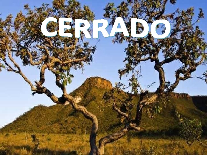 CARACTERÍSTICAS ØOcupa 24% do território brasileiro ØPossui árvores de pequeno porte com casca grossa e galhos retorcidos aparentando ser um bioma seco. Porém, apresenta grande quantidade de água no subsolo ØVárias áreas foram desmatadas e queimadas para a introdução de pecuária e agricultura
