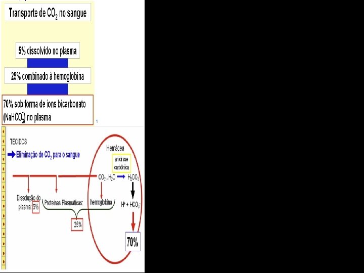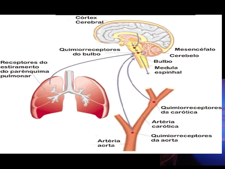 Imediatamente, um comando localizado no bulbo – ou medula oblonga (um órgão componente do nosso sistema nervoso central) enviaria a mensagem aos músculos respiratórios, fazendo com que se contraíssem. Esse centro de comando, conhecido como centro respiratório bulbar, é altamente sensível ao aumento de CO 2 no sangue e à diminuição do p. H sanguíneo decorrente do acúmulo desse gás. Lembre-se que o CO 2 em solução aquosa forma H 2 CO 3, ácido carbônico, que se ioniza em H+ e H 2 CO 3 -. O aumento da acidez e o próprio CO 2 em solução física no plasma estimulam os neurônios do centro respiratório. Consequentemente, impulsos nervosos seguem pelo nervo que inerva o diafragma e a musculatura intercostal, promovendo a sua contração e a realização involuntária dos movimentos respiratórios. De início, ocorre uma hiperventilação, ou seja, o ritmo dos movimentos respiratórios aumenta na tentativa de expulsar o excesso de gás carbônico. Lentamente, porém, a situação se normaliza e a respiração volta aos níveis habituais.