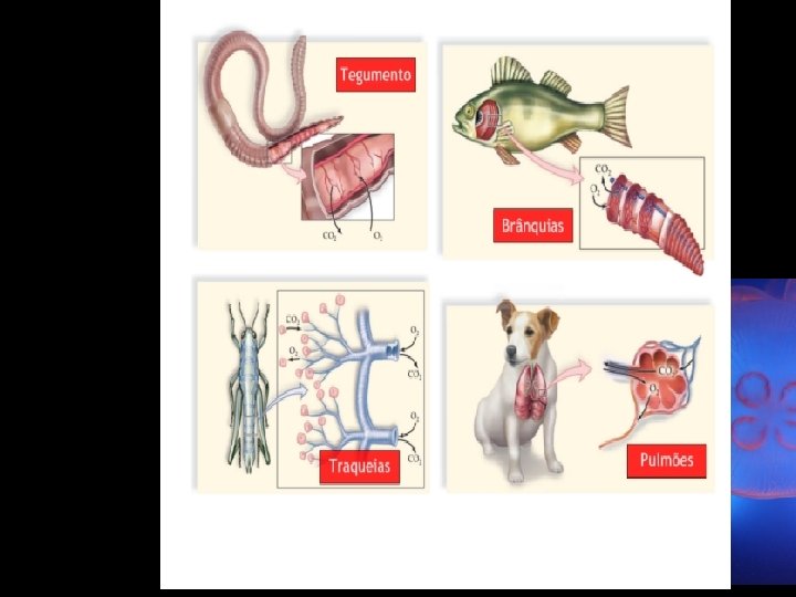RESPIRAÇÃO ANIMAIS Difusão Esponjas, celenterados, platelmintos e nematelmintos Cutânea Minhocas e planárias Traqueal Insetos, quilópodes e diplópodes Filotraqueal Aracnídeos Invertebrados (alguns anelídeos, crustáceos, alguns moluscos e equinodermas) Branquial Pulmonar Vertebrados (ciclóstomos, peixes e larvas de anfíbios) Moluscos terrestres, Anfíbio adultos, répteis, aves e mamíferos