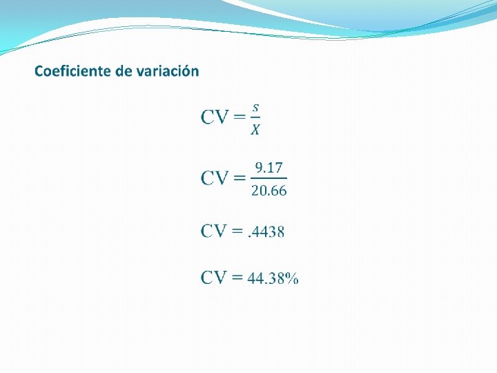 X M X-M (X-M)2 15 20. 66 -5. 66 33. 04 16 20. 66 -4. 66 21. 72 20 20. 66 -0. 66 0. 44 23 20. 66 2. 34 5. 48 25 20. 66 4. 34 18. 84 34 20. 66 13. 34 177. 95 0 351. 39 ∑ 351. 39 / 9 – 1 = 84. 1 Varianza √ 84. 1 = 9. 17 Desviación estándar Nótese que los valores que se encuentran abajo de la media tienen discrepancias negativas y los que están arriba de la media las tienen positivas.