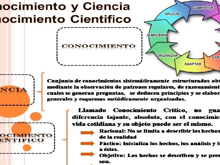 Características especificas del Conocimiento Científico • • • Fáctico: la objetividad de la ciencia constituye la verdad fáctica. Critico: esta expuesto a criticas y la falsabilidad. Trasciende los hechos: se maneja con un cierto grado de abstracción. Analítico: es procedimiento mental que consiste fragmentar una totalidad Especializado: delimita el objeto de estudio. Claro y preciso: contrario al conocimiento vago. Comunicable: la ciencia desarrolla su propia Jerga , o lenguaje especial. Verificable por medio dos vías : a) Experimentación = Fáctica b) Demostración= Formal Sistémico: es una estructura de conceptos Metódico: