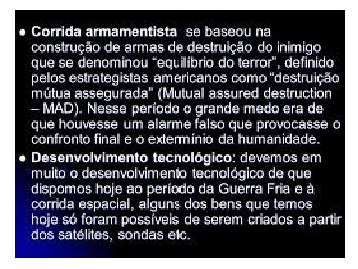 EQUILÍBRIO DO TERROR = indicava o período da Guerra Fria, onde havia a instabilidade política mundial, que se refletia no perigo iminente de uma guerra nuclear.