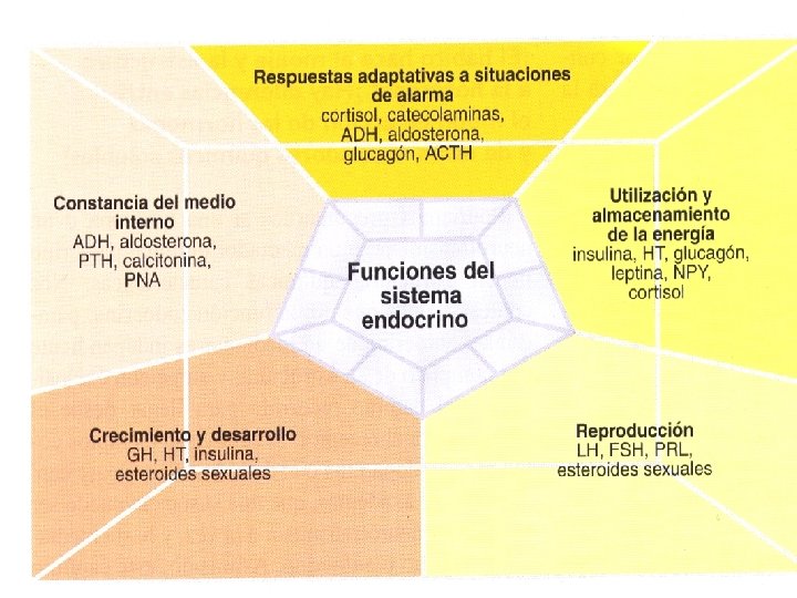 Función Endocrina Percepción del estímulo por parte de la célula Liberación de la hormona Transporte hacia el órgano blanco (target) Unión de hormona a receptores específicos Respuesta celular Efectos fisiológicos Regulación de la secreción hormonal