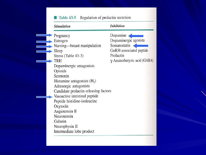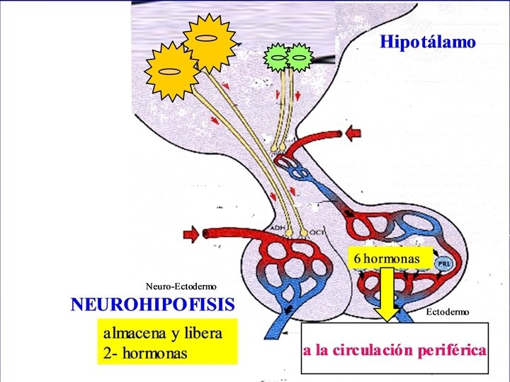 Hormonas Inhibidoras Hipotálamo Adenohipofisis ---------------------------- • Somatostatina (GH-IH) ↓ GH • Dopamina ↓ Prolactina