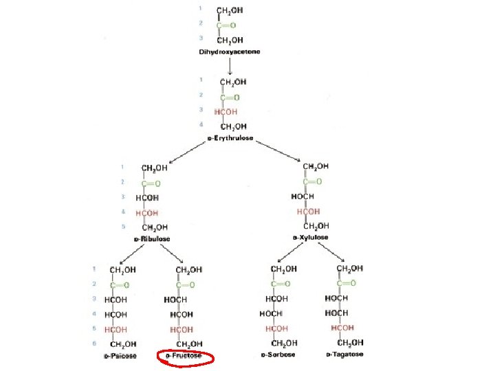 Monosaccharides • Two families of monosaccharides – Aldehydes with multiple OH groups (aldose) – Ketones with multiple OH groups (ketose) • Chemical structures of monosaccharides – Triose, tetrose, pentose, hexose, heptose • Smallest one: (CH 2 O)3 e. g. : D(L)-glyceraldehyde • Hexoses are the most common monosaccharides in nature • D-ribose and 2 -deoxy-D-ribose are components of nucleotides and nucleic acids – All except one monosaccharides have asymmetric centers • Fisher projection representation • Perspective representation