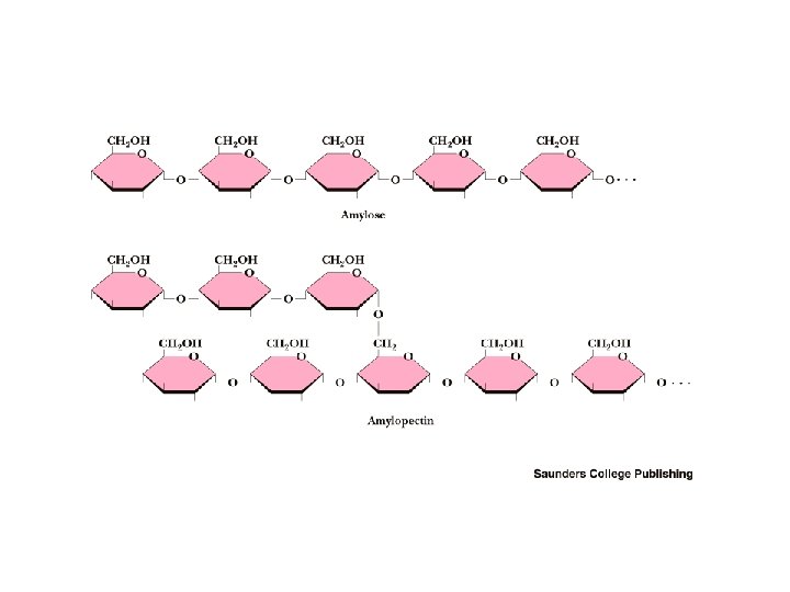 Starch A plant storage polysaccharide • Two forms: amylose and amylopectin • Most starch is 10 -30% amylose and 7090% amylopectin • Branches in amylopectin every 12 -30 residues • Amylose has alpha(1, 4) links, one reducing end