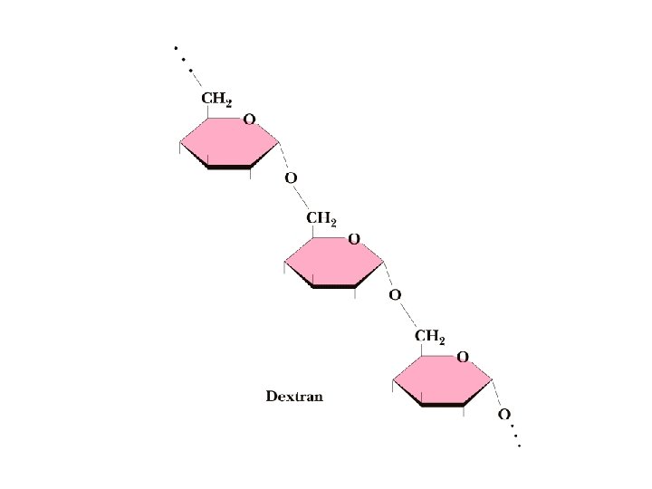 Dextrans A small but significant difference from starch and glycogen • If you change the main linkages between glucose from alpha(1, 4) to alpha(1, 6), you get a new family of polysaccharides dextrans • Branches can be (1, 2), (1, 3), or (1, 4)