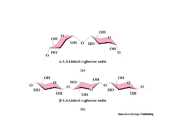 Structural Polysaccharides Composition similar to storage polysaccharides, but small structural differences greatly influence properties • Beta(1, 4) linkages make all the difference! • Strands of cellulose form extended ribbons