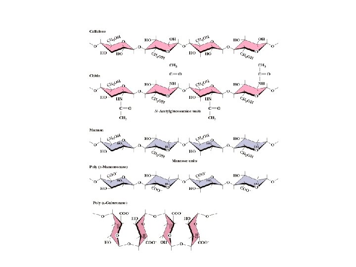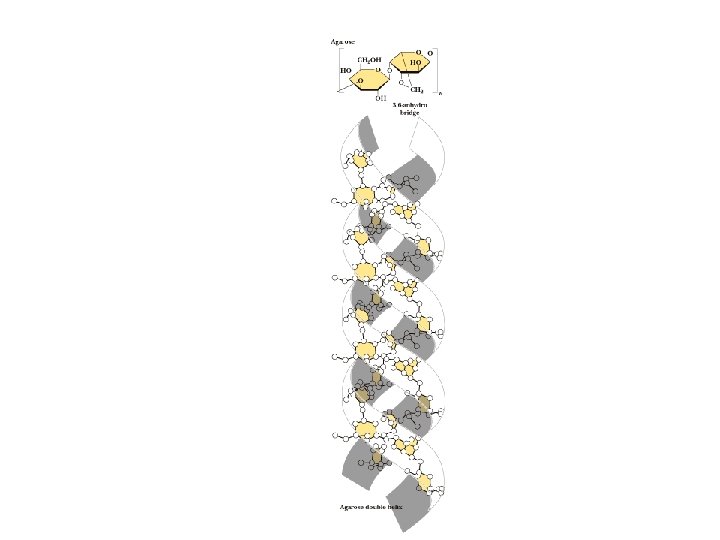 Other Structural Polysaccharides • Alginates - Ca-binding polymers in algae – Eg. CARAGEENAN • alternating 3 -linked-α-D-galactopyranose and 4 -linked-β-Dgalactopyranose units • Sulfonated, uses cations to gel; Common types • Agarose and agaropectin - galactose polymers • Glycosaminoglycans - repeating disaccharides with amino sugars and negative charges