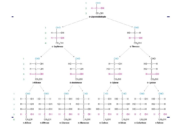 Monosaccharides • Fischer projections of monosaccharides • D, L designation refers to the configuration of the highest-numbered asymmetric center • D, L only refers the stereocenter of interest back to D- and L-glyceraldehyde! • D, L do not specify the sign of rotation of plane-polarized light!