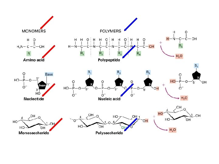 Making and breaking polymers • Polymers are synthesised from monomers using condensation reactions; when 2 monomers are combined, one water molecule is released • Polymers are broken down into individual monomers using hydrolysis; when a a polymer is broken down after the addition of water