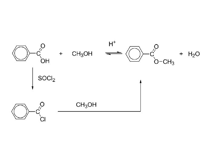 b) esters c) “direct” esterification: d) H+ RCOOH + R´OH RCO 2 R´ + H 2 O e) -reversible and often does not favor the ester f) -use an excess of the alcohol or acid to shift equilibrium g) -or remove the products to shift equilibrium to completion h) “indirect” esterification: i) RCOOH + PCl 3 RCOCl + R´OH RCO 2 R´ j) -convert the acid into the acid chloride first; not