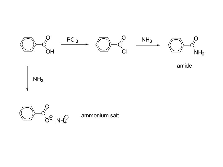 c) amides d) “indirect” only! e) RCOOH + SOCl 2 RCOCl + NH 3 RCONH 2 f) amide g) Directly reacting ammonia with a carboxylic acid results in an ammonium salt: h) RCOOH + NH 3 RCOO-NH 4+ i) acid base
