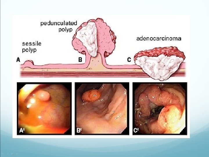 • Fumo e inquinamento ambientale Fattori genetici: - storia familiare della malattia - sindromi trasmesse ereditariamante (adenomatosi poliposa familiare o FAP; sindrome di Lynch. . ) • Altri fattori: - eta’ - presenza di polipi nel colon - processi infiammatori cronici dell’intestino •