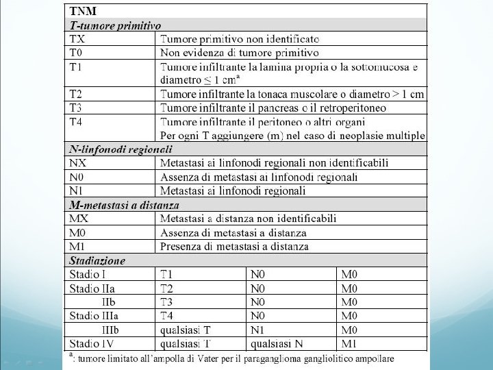 STADIAZIONE Il sistema TNM si basa sulla valutazione di tre elementi: • T : estensione del tumore primitivo • N : assenza o presenza ed estensione di metastasi ai linfonodi regionali • M : assenza o presenza di metastasi a distanza L’aggiunta di numeri a queste 3 componenti indica l’estensione del tumore: T 0, T 1, T 2, T 3, T 4 N 0, N 1, N 2, N 3 M 0, M 1