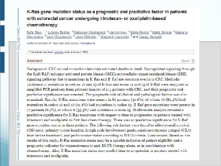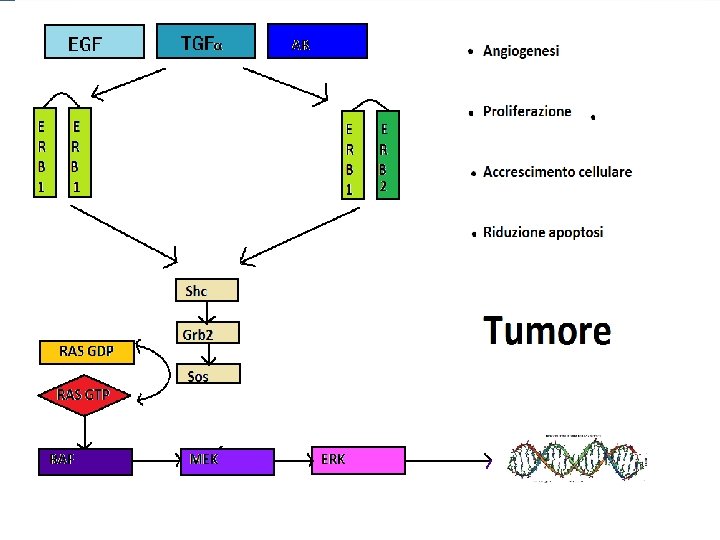 Gene K-ras Il gene K-ras ha una funzione fondamentale nel sistema di trasduzione del segnale valle dell’EGFR e ha un ruolo di estrema importanza nella regolazione della crescita cellulare, nella promozione dell’angiogenesi e nella riduzione dell’apoptosi. Fa parte della famiglie delle proteine Ras , una classe di proteine GTPasiche , di cui fanno parte anche NRas e HRas.